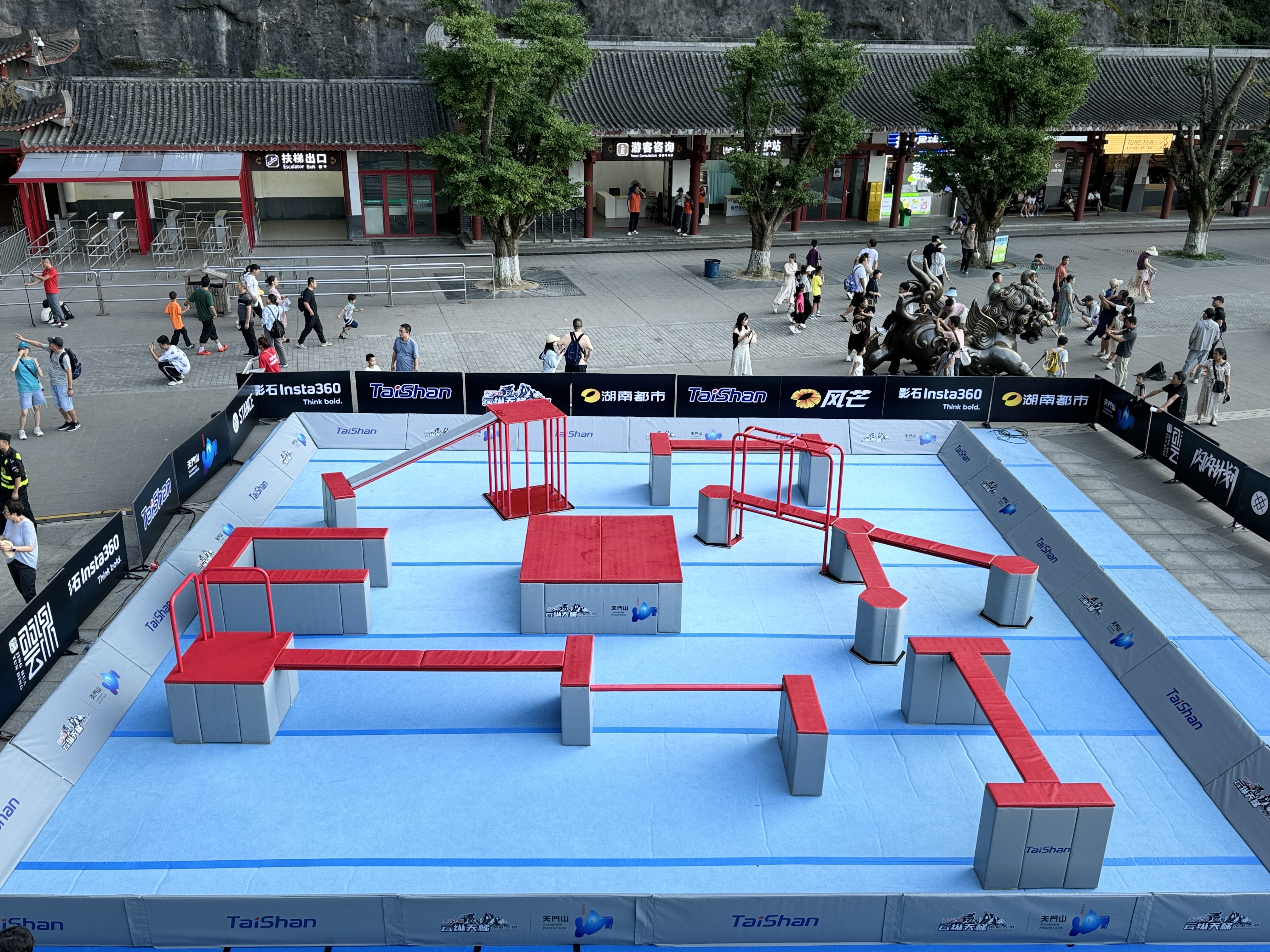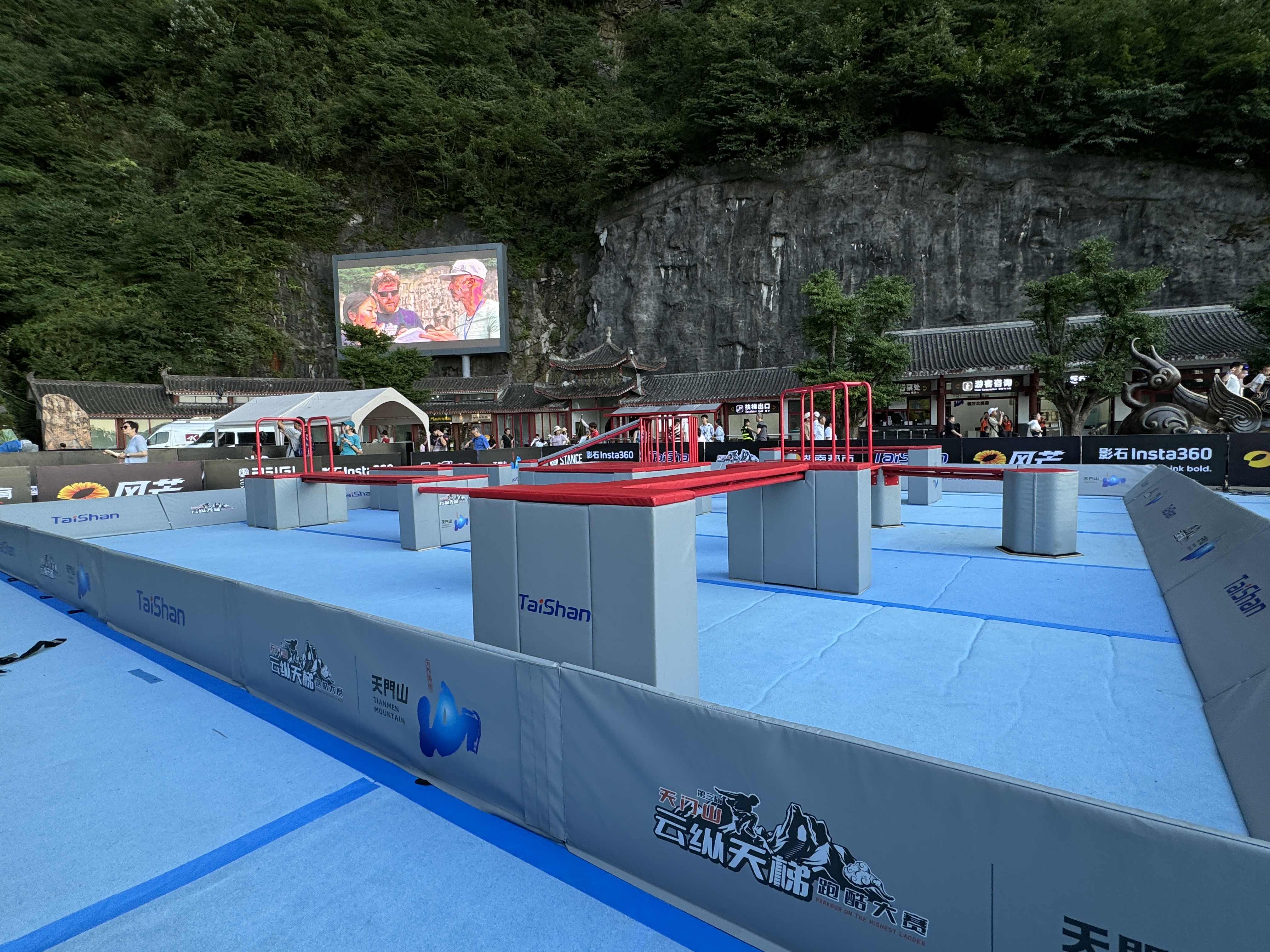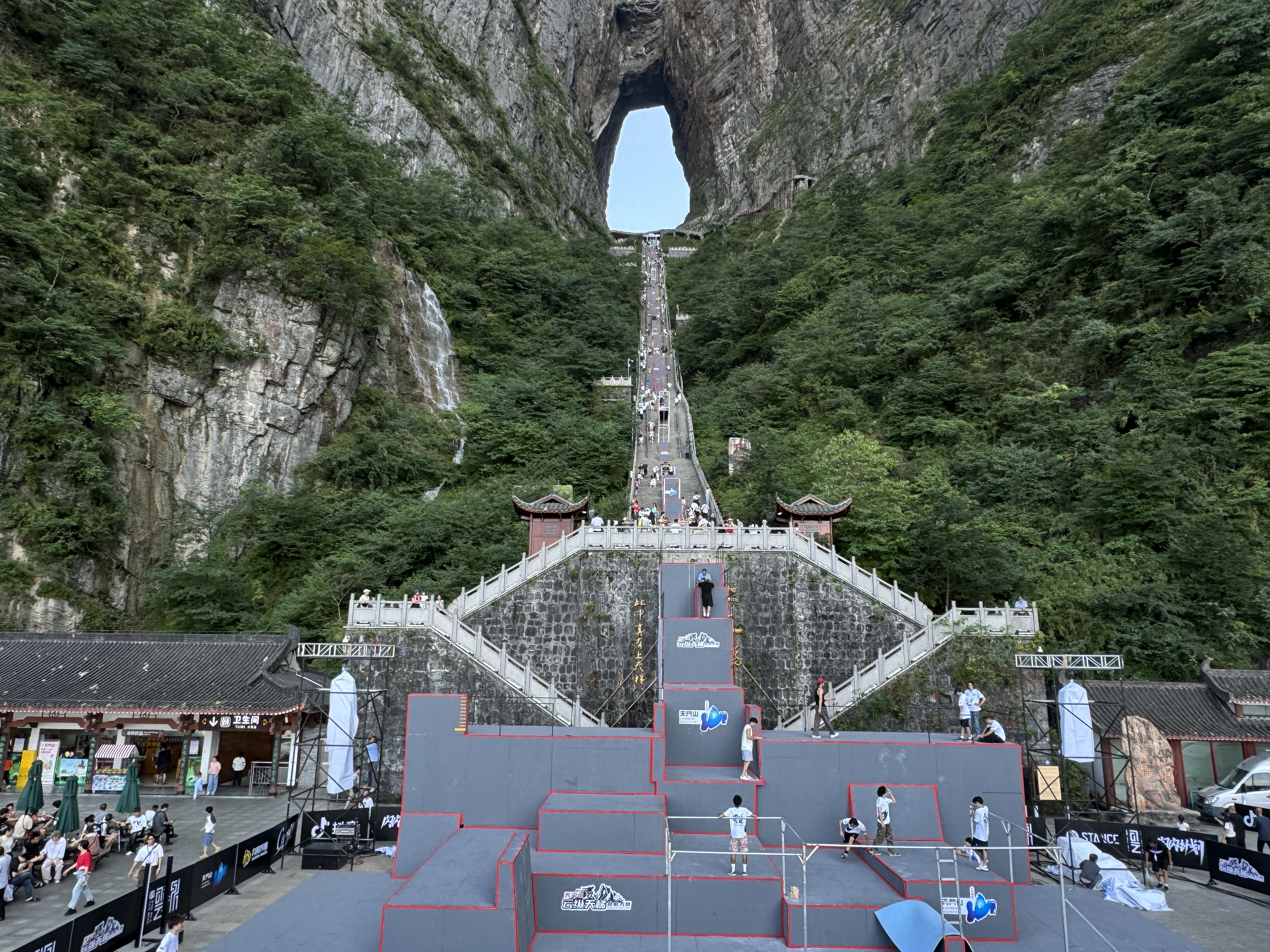 本场赛事的赛道依附于天门洞999级天梯搭建,赛道起点设在世界海拔最高天然穿山溶洞“天门洞”洞口,沿着狭窄陡峭、共有999级台阶的登山步道“天梯”向下一直延伸至游客广场,全长近300米,垂直落差达150米,分五缓四陡,平均斜度45度,共设置108组障碍道具。有了pg电子体育跑酷器材的加持,赛事将更加精彩刺激。