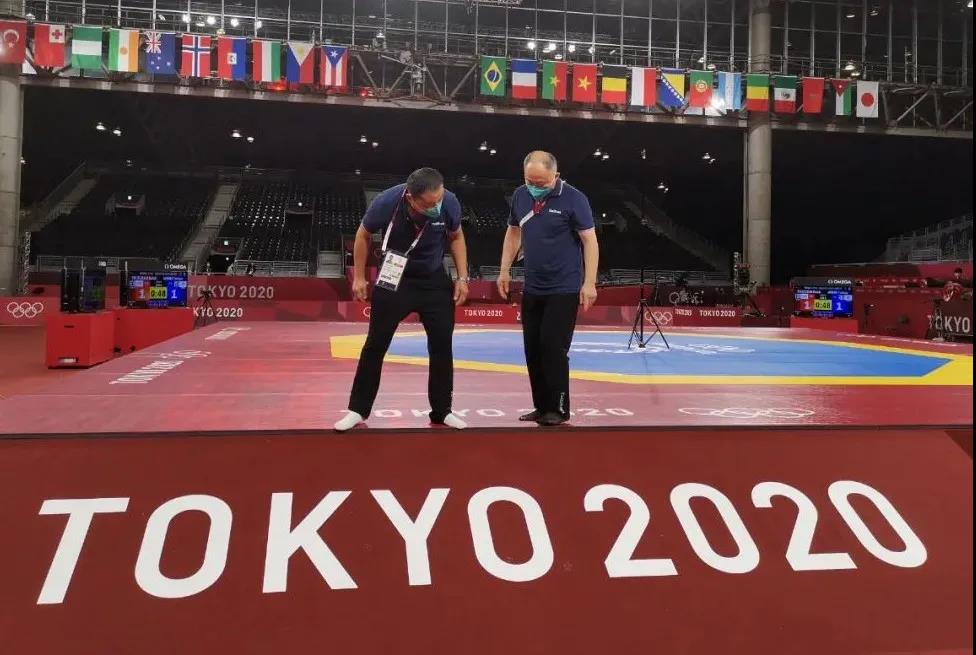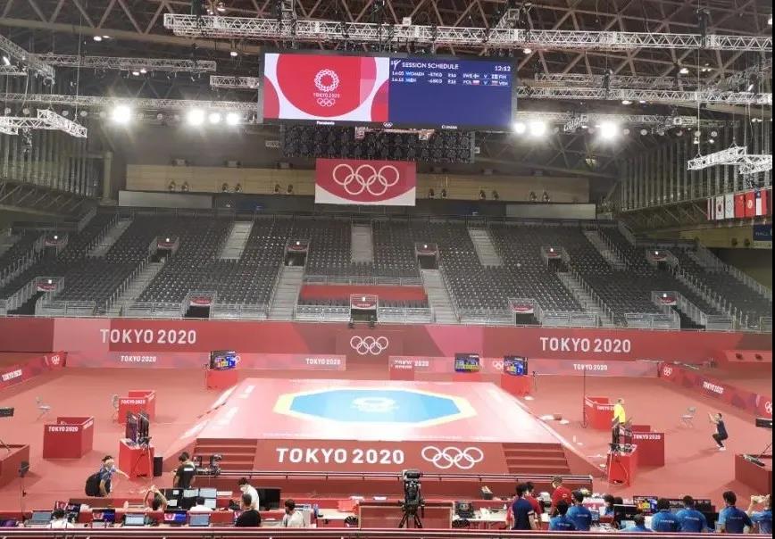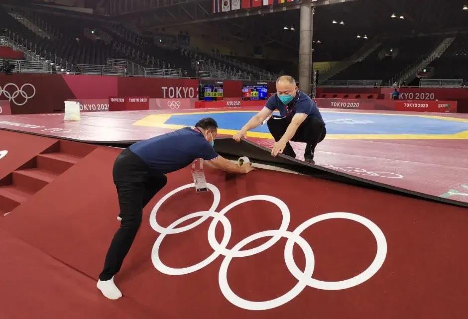2021年7月20日,日本武道馆——奥运会柔道比赛场地。pg电子体育东京奥运会服务保障团队正在布置、安装柔道器材