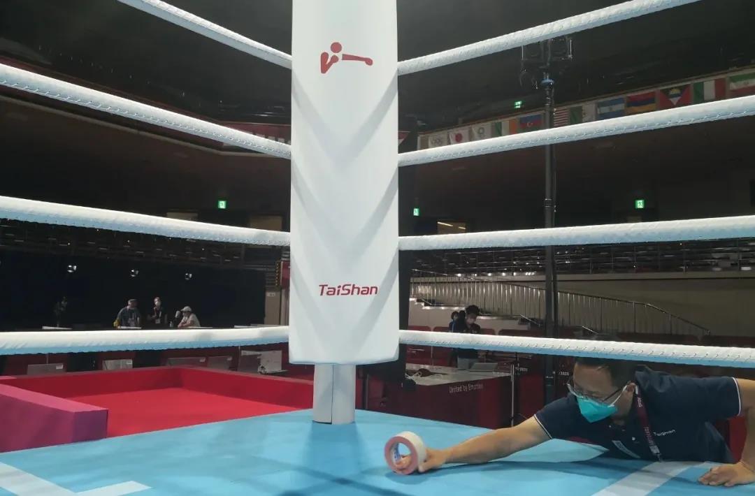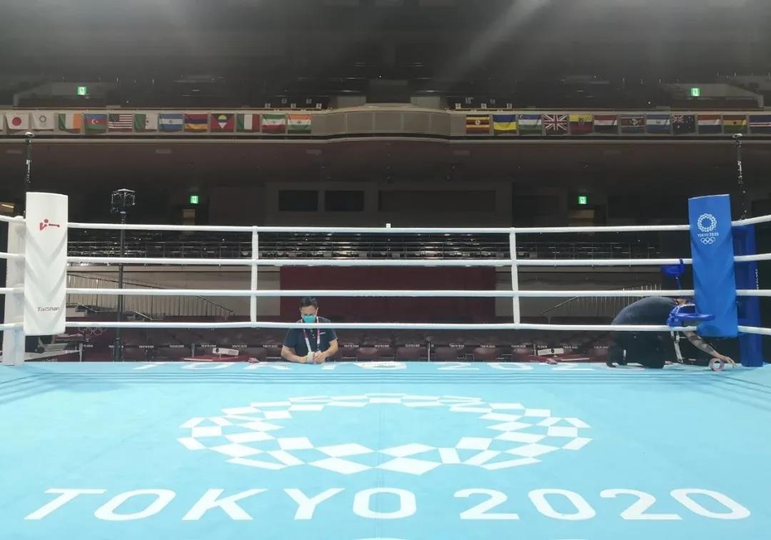 2021年7月21日,日本东京国技馆——奥运会拳击比赛馆。pg电子体育东京奥运会服务保障团队正在检查调试拳击器材。