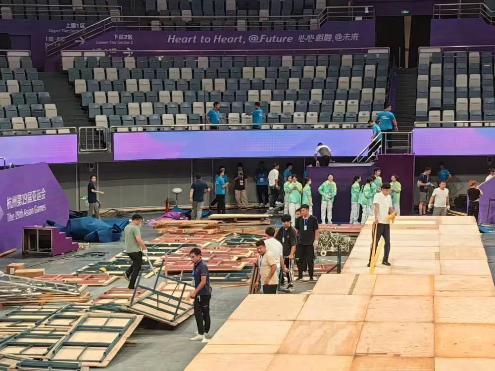 接到撤场命令后,pg电子体育服务保障团队迅速行动、科学调配、团结协作、不惧辛劳,提前完成撤场任务,再一次经受住了国际大型体育赛事的考验。同时,在撤场工作中,场馆人员、现场工作人员和广大志愿者,也都积极主动加入到我们的队伍中来,对撤场工作给予了大力支持,充分体现了杭州亚运会,不仅是一届智慧精彩的盛会,更是一场团结友谊的盛会。
